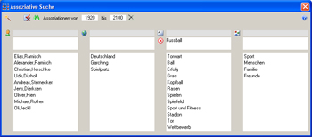 ![]() | Findet Assoziationen (Schlagworte, Orte, Personen, Kategorien) zu einem oder mehreren Begriffen. Die Ergebnisse werden in den Ergebnislisten im unteren Teil des Dialoges angezeigt. |