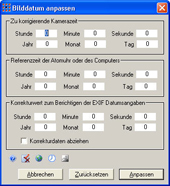 Geben Sie hier die Zeit- und Datumsangabe ein, die im aktuellen Bild angezeigt werden sollte. Anschließend wird aus der zu korrigierenden und der hier eingegebenen Referenzzeit der Wert der zu korrigierenden Angaben berechnet, die im unteren Abschnitt des Dialoges angezeigt werden.