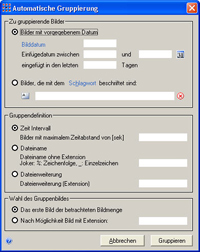 Mit diesem Dialog, den Sie über das Menü über Extras-Automatisch gruppieren... erreichen, können Sie eine eigene Auswahl von Bildern automatisch nach verschiedenen Kriterien (frei definierbarem Intervall, Dateiname, Dateierweiterung) zu Bildgruppen zusammenfassen.