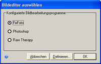 Wenn nach den aktuellen Einstellungen keine eindeutige Zuordnung zum Bildbearbeitungsprogramm getroffen werden kann, öffnet sich diser Dialog. Damit können Sie entweder eines der bereits konfigurierten Programme zur Bearbeoitung auswählen, oder die Konfiguration ändern.