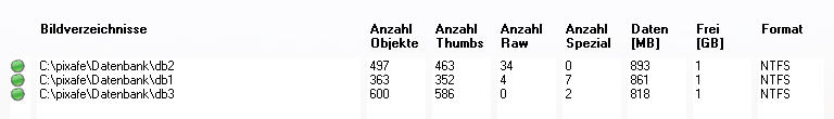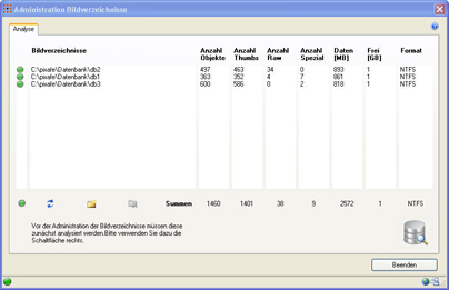 Nach dem Start des Administrationswerkzeugs erfolgt eine Kurz-Analyse der konfigurierten Bildverzeichnisse. Man erhält sodann eine Übersicht über die Verzeichnisse mit Angabe von folgenden Informationen: