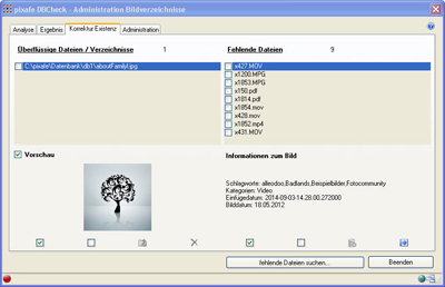 Zu einer ausgewählten fehlenden Datei werden die Informationen angezeigt, die dazu in der Datenbank hinterlegt sind. Sollten in den aktuell konfigurierten Bildverzeichnissen Objekte (Bilder, Videos, Sonderformate...) fehlen, können diese mit der Schaltfläche fehlende Dateien suchen... aufgespürt und bereitgestellt werden. Das ist auch sehr hilfreich zum Aufbau eines inkrementellen Backup der stetig wachsenden Bildverzeichnisse des Bildbestandes (vergleiche auch die folgende Dokumentation )