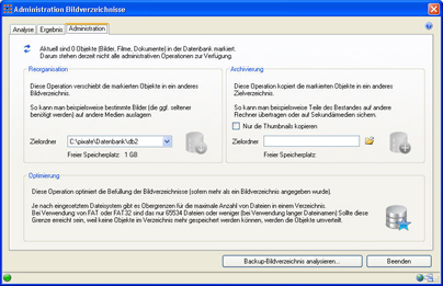 Auf diesem Reiter stehen 3 administrative Funktionen zur Verfügung, mit denen man die in der Datenbank markierten Objekte in ein anderes Bildverzeichnis verschieben kann, bzw. die in der Datenbank markierten Objekte in Kopie in ein anderes Verzeichnis kopiert werden können. Mittels Funktion Optimierung wird die Verteilung der Objekte auf die zur Verfügung stehenden Bildverzeichnisse durchgeführt.