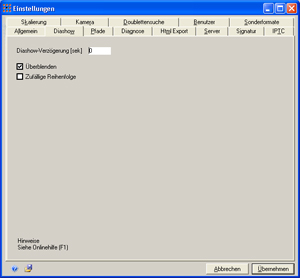 Die Einstellungen, die auf diesem Dialog gemacht werden, dienen dazu, den Ablauf beim Vorführen selektierter Bilder zu kontrollieren.