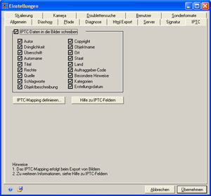 Mit diesre Schaltfläche öffnen Sie den Dialog zur Definition des IPTC-Mappings mit dem eine Abbildungsvorschrift angegeben werden kann, die festlegt, wie die IPTC-Daten der Datenbank in die entsprechenden Felder eines exportierten Bildes geschrieben werden.