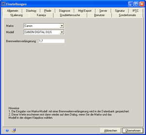 Wählen Sie hier das gewünschte Modell der Kamera, zu der Sie eine Brennweitenverlängerung eingeben möchten.