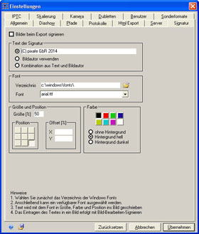 Die in diesem Dialog vorgenommenen Einstellungen können Sie in einem beliebigen Bild testen, verwenden Sie dazu bitte den Befehl Signieren im Menü Bild-Bearbeiten