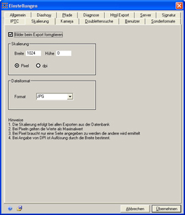 Wenn dieser Schalter gesetzt ist, werden die Bilder beim exportieren, speichern und beim erzeugen von HTML-Seiten in das Format skaliert, das unter Skalierung angegeben wurde. Außerdem wird ggf. eine Formatkonvertierung nach TIF oder JPG durchgeführt.