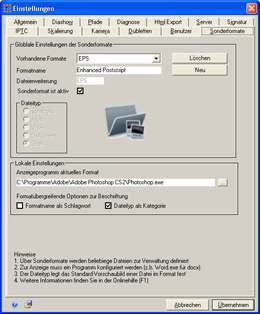Ist diese Option gewählt, wird der vom Benutzer festgelegte Name des Sonderformates bei den importierten Dateien dieses Typs als Schlagwort gespeichert.