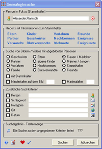Mit Hilfe des Dialoges Genealogiesuche kann man gezielte Detailsuchen zu Personen, Ereignissen und Ereigis- und Wohnbsorten durchführen, die mit Hilfe von pixafe Family angereichert und zurück in die Datenbank exportiert wurden.