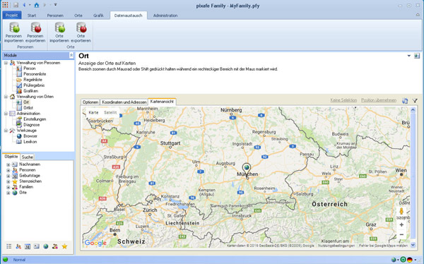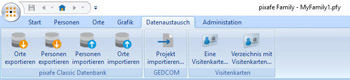 Mit pixafe Family können Sie nicht nur neue Personen und Orte anlegen, sondern auch ganz einfach Zusatzinformationen zu bestehenden Personen und Orten in der pixafe Classic Datenbanbk erfassen. Zu diesem Zweck dienen die Funktionen zunm Personen- und Orte- Austausch, die über den Reiter Datenaustausch aufgerufen werden.