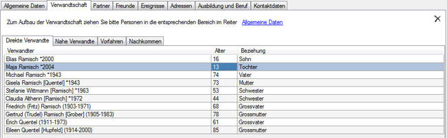 Auf diesem Reiter werden die zur aktuellen Person verwandten Personen tabellarisch aufgeführt, und zwar separat für direkte Verwandte (Großeltern, Eltern, Geschwister, Kinder), nahe Verwandte (zusätzlich die Verwandtschaft über den Partner und auch die Partner der Geschwister, also Schiegereltern, Onkel, Tanten, Schwager, etc.), Vorfahren und Nachkommen.