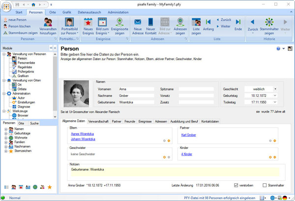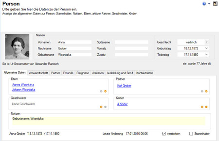 ![]() | Das Änderungsdatum der Personendaten hilft dabei einen umfangreichen Stammbaum konsistent pflegen zu können |