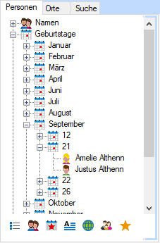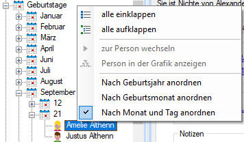 Dieser Teilbaum zeigt die Geburtstage aller verwalteten Personen: ![]() Durch Rechtsklick mit der Maus auf den Knoten Geburtstage kann festgelegt werden, wie diese angezeigt werden sollen: ![]() Bei Option nach Monbat und Tag anordnen (wie in obiger Darstellung), werden die Monate und Tage der Geburtstage aufgelistet und unterhalb des Tages die passenden Personen angezeigt. Bei nach Geburtsjahr anordnen, werden die Jahreszahlen der Geburtstage aller Personen aufgelistet und unterhalb des Jahres die Personen angezeigt, die in dem Jahr Geburtstag haben. Bei nach Geburtsmonat anordnen, werden nur die Monate der Geburtstage aller Personen aufgelistet und unterhalb der Monate die passenden Personen angezeigt. |