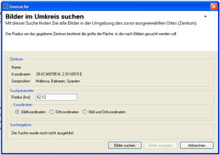 in dem die gewünschten Bilder gefunden werden sollen. Die Eregnbisse lassen sich nach der Suche dann sofort auf der Karte anzeigen: