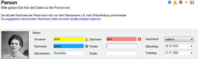 Bei der Angabe von Namen ist darauf zu achten, dass diese mit Großbuchstaben beginnen. Andernfalls wird im Infopanel eine Warnung ausgegeben - die Daten können aber dennoch gespeichert werden.