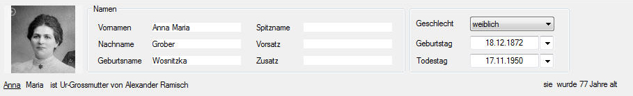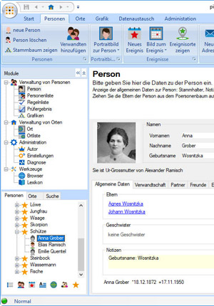 Die wichtigsten Informationen zur Person finden Sie neben dem Portraitbild: Namen, Datumsangaben und Geschlecht. Unterhalb dieser Daten wird die Beziehung der Person zum Stammhalter angezeigt