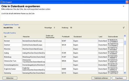 Entfernen Sie einfach die Orte aus der Tabelle, die Sie nicht in die Bilddatenbank exportieren möchten. Die verbleibenden Orte werden dann durch Klick auf die Schaltfläche Exportieren in die Datenbank exportiert.