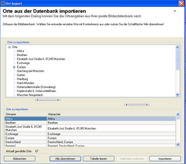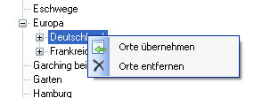 Die im oberen Baum dargestellten Ortsangaben aus der Bilddatenbank können entweder mit der Schaltfläche Alle übernehmen zum Import nach pixafe Family ausgewählt werden. Alternativ können die Orte (mit allen Unterorten) mit dem Kontext Menü selektiert oder wieder entfernt werden: