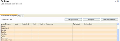 Nach dem erfolgreichen Import der Orte nach pixafe Family stehen diese in der Ortliste zur Verfügung. Hier kann man die zu den Orten gehörigen Geokoordinaten mit einem Klick auf die Schaltfläche Alle geokodieren ermitteln.