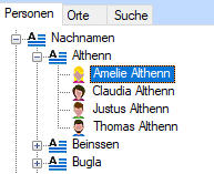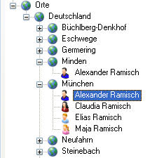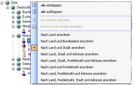 aufgelistst und die aktuelle Person bei allen passenden Ortsangaben markiert.![]() Durch Rechtsklick mit der Maus auf den Knoten Orte kann festgelegt werden, wie diese angezeigt werden sollen: ![]() Je nach getroffener Auswahl werden die Ortsangaben gruppiert angezeigt und die verwalteten Personen passend einsortiert. |