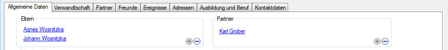 Unter diesen zentralen Daten der Person finden Sie mehrere Reiter mit Detaildaten zu den Beziehungen der Person: Allgemeine Daten, Verwandtschaft, Partner, Freunde, weitere Ereignisse, Adressen, Ausbildung und Beruf und Kontaktdaten