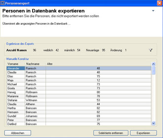Mit Selektierte Entfernen entfernen Sie die aktuell in der Tabelle selektierten Namen, um diese vom anschließenden Export auszuschließen.