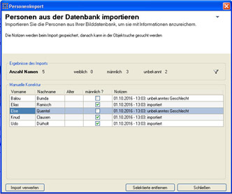Der Dialog öffnet sich mit einer tabellarischen Übersicht mit genau denjenigen Personen aus der Bilddatenbank, die in pixafe Family noch nicht existieren, um diese als neue Personen zu übernehmen.