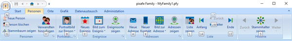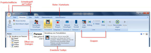 Funktionen des Programms![]() Verfügbare Tastaturkürzel kann man sich anzeigen lassen, ohne in der Onlinehilfe nachschlagen zu müssen: Durch Drücken der ALT Taste erscheinen die Tips für einen Augenblick ![]() Drückt man dann die Zeichen eines Tips für eine Ribbongruppe, wird dorthin gewechselt - z.B. P für Personen ![]() Durch Eingabe der angezeigten Tastaturkürzel werden sodann die zugehörigen Funktionen ausgeführt. Die Darstellung kann angepasst werden, hier eine Erläuterung der wichtigsten Bestandteile: ![]() |