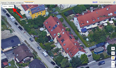 Sollten die zum Bild erfassten Geokoordinaten nicht ganz korrekt sein, besteht die Möglichkeit, die Position des Bildes direkt in dieser Katenansicht zu korrigieren. Dazu verschieben Sie einfach das Bild an die gewünschte Position. Zur genaueren Ortsbestimmung kann dazu die Karte auch als Satellitenbild umgeschaltet werden.