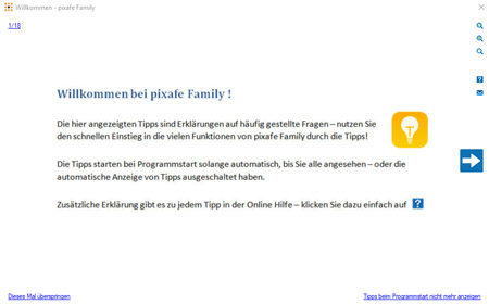 Nach dem ersten Programmstart werden die Tipps eingeblendet. Man kann jetzt alle Tipps durchblättern und diese auch parallel dazu ausprobieren. Möchte man die Tour durch alle Tipps vorzeitig verlssen, gibt es folgende Möglichkeiten: