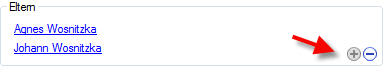 Im Beispiel ist das Hinzufügen weiterer Personen deaktiviert, da bereits beide Elternteile erfasst wurden. Durch Klick auf die - Schaltfläche erscheint ein Dialog zur Auswahl des zu entfernenden Elternteils. Nach dem Entfernen kann man dann mittels (+) eine neue Person auswählen.