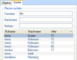 Durch Eingabe des Anfangs vom Vornamen, Nachnamen oder den Notizen zur Person werden sofort alle möglichen Personen in der unten aufgelisteten Treffermenge angezeigt.