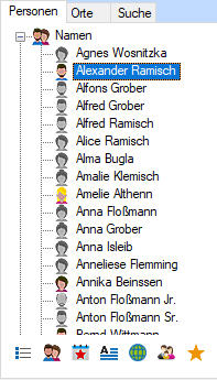 Die aktuelle Person wird durch Klick auf die Schaltfläche des jeweiligen Teilbaums expandiert, durch Doppelklick auf eine beliebige angezeigte Person wird zu dieser Person im Person-Dialog gewechselt und deren Detaildaten angezeigt.
