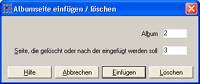 Zu diesem Zweck dient die Funktion Seite einfügen / löschen. Sie geben einfach über den folgenden Dialog die Nummer des Albums ein und die Seite, die gelöscht, bzw. nach der eine neue Seite eingefügt werden soll.