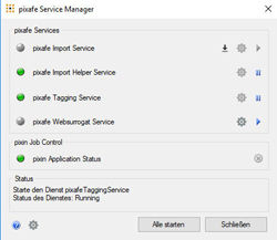 Mit diesem Dialog können die pixafe Dienste installiert, konfiguriert und ganz einfach gestartet und gestoppt werden. Der Servicemanager darf aber nicht gemeinsam mit pixafe Classic ausgeführt werden, darum gibt es eine entsprechende Hinweismeldung, wird er bei laufendem pixafe Classic gestartet oder wenn pixafe Classuc gestartet wird während der Servicemanager noch aktiv ist.
