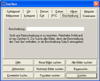 Mit Hilfe dieses Dialogs (genauer gesagt dem Reiter auf dem Dialog zur Suche ) kann ein Bild zu seiner Beschreibung gesucht werden.