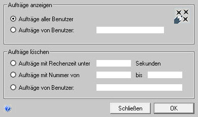 In diesem Dialog können Sie diese Aufträge zu einem Bennutzer oder alle Aufträge anzeigen oder aus der Datenbank entfernen. Beim Entfernen besteht die Möglichlkeit Aufträge zu Rechenzeit zu löschen. Dsa ist beispielsweise dann sinnvoll, wenn man hier alle kleinen Aufträge entfernen möchte, bei denen selbst keine grafische Analyse mehr durchgeführt wurde und der Auftrag dann in wenigen Sekunden abgeschlossen wurde.