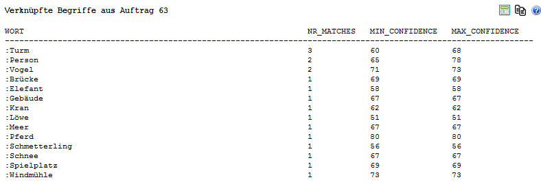 Im Report aufgelistet sind hier die KI-Begriffe (erkennbar an dem führenden Doppelpunkt). Der Begriff :Turm wurde in dem Beispiel 3x (Spalte NR_MATCHES) erkannt. Die Ereknnung erolgte mit Konfidenzwerten zwischen 60% und 68%. Um die betreffenden Bilder zu analysieren, könnte man nun die Ergebnisse zu Auftrag Nummer 63 anzeigen lassen und dann die Bilder zum betreffenden Begriff ansehen und ggf. korrigieren.