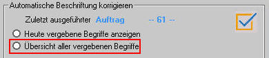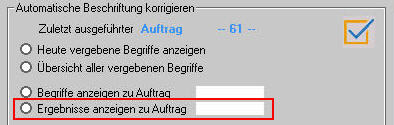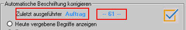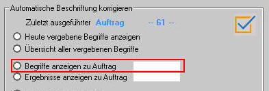 Geben Sie die Auftragsnummer des Beschriftungsauftrages an, zu dem Sie sich die vergebenen Begriffe ansehen möchten. Sie sehen die Nummer des zuletzt ausgeführten Auftrags bereits im Dialog selbst (in dem Beispiel -- 61 --).