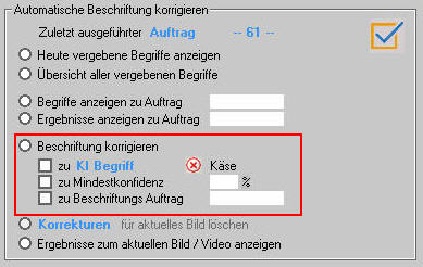 Nachdem Sie sich eine Übersicht über die vergebenen Begriffe verschafft haben, können Sie die fehlerhaften Beschriftungen nun korrigieren. Geben Sie dazu den zu korrigierenden Begriff, optional die ermittelte Mindestkonfidenz und optional die betreffende Auftragsnummer an. Als Ergebnis werden die Bilder selektiert, die den angegebenen Selektionskriterien entsprechen.