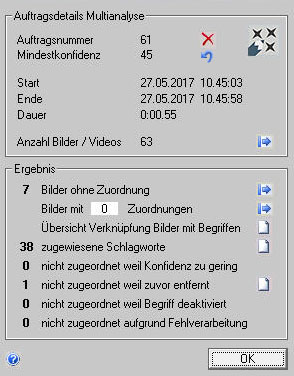 Durch Klick auf den Link des letzten Auftrags (-- 61 --) wird das Ergebnis dieses Beschriftungs-Auftrags in folgendem Dialog angezeigt: Der Dialog zeigt oben die Auftragsnummer und die hierzu verwendete Mindestkonfidenz und die Laufzeit sowie die Anzahl der betrachteten Bilder an.