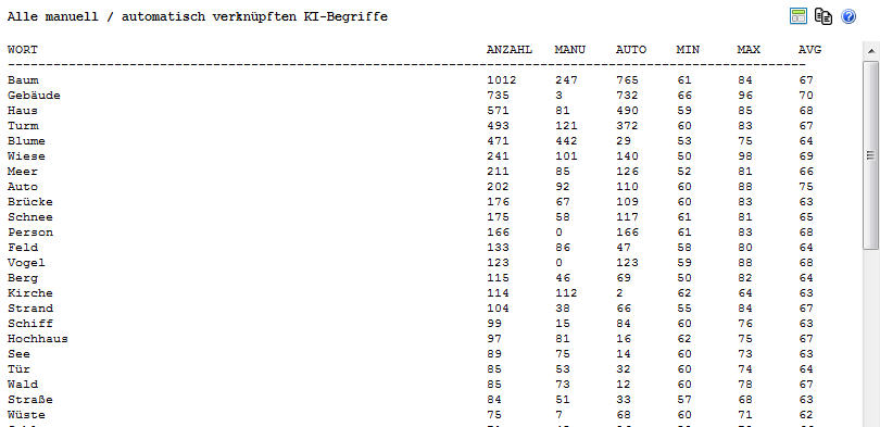 Dieser Report erzeigt eine Übersicht, aus der ersichtlich wird, wie oft die einzelnen KI-Begriffe bereits mit Bildern verknüpft werden konnten. Dabei wird jeder der möglichen KI-Begriffe aufgelistet, auch dann, wenn es noch keine Bilder dazu gibt. Dieser Report ist nur dann für Korrektren relevant, wenn hierbei Begriffe genannt werden, die für Ihren Bildbesstand ungewöhnlich sind. Man kann damit dann Stichproben durchführen.