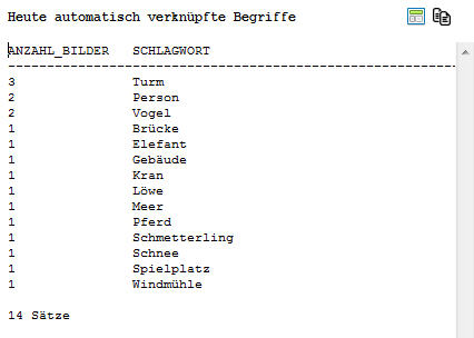 Der angezeigte Report mit den heute vergebenen Begriffen sieht etwa so aus (s.u.): Es wurden 3 Bilder mit Turm beschriftet und 2 Bilder mit Person, 2 Bilder mit Brücke etc.