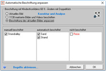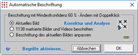 Es können entweder das aktuell angezeigte (Option Aktuelles Bild), oder alle markierten Bilder und Videos (Option ... markierte Bilder und Videos) automatisch beschriftet werden.