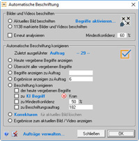 Mit diesem Dialog wählen Sie die gewünschte Funktion zur automatischen Beschriftun von Bildern und Videos. Die Funktion ist verfügbar, sobald die Tagging Engine in den Einstellungen mit dem Schalter Tagging Engine verwenden erfolgreich aktiviert wurde.