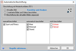 Bei der automatischen Beschriftung von einer Menge markierter Bilder und Videos besteht die Möglichkeit vorher die irrelevanten Begriffe zu deaktivieren. Die deaktivierten Begriffe werden dann den Bildern nicht zugeordnet. Diese Möglichkeit verhindert Fehlzuordnungen aufgrund von mehrdeutigen Erkenntnissen. (Z.B. Zuordnung des Begriffes Schnee bei einem Schneeweißen Strand) Klicken Sie dazu bitte auf den Link Begriffe aktivieren