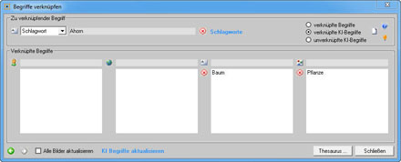 Eine Verknüpfung zweier Begriffe miteinander bewirkt, dass ein Bild (oder Video, oder beliebiges Sonderformat), das mit dem Quellbegriff beschriftet wurde autoamatisch auch mit dem verknüpften (Ziel-)begriff beschriftet wird.