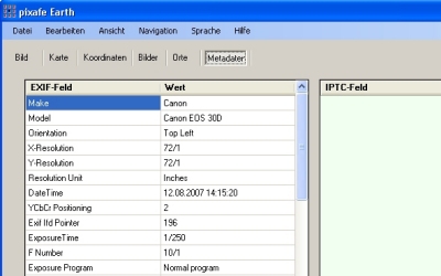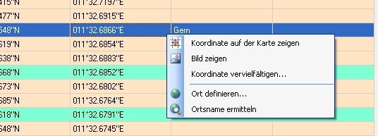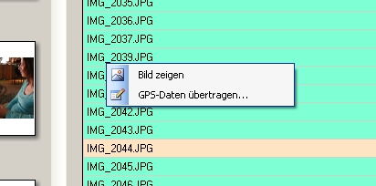 Über das Kontextmenü kann man sich zu jedem Eintrag in der Bildliste das zugehörige Foto anzeigen lassen, dabei springt die Anwendung in die Bild-Ansicht. Die weitere Funktion des Kontextmenus GPS-Daten übertragen dient dazu, die GPS-Koordinaten und auch die Ortsnamen zum selektierten Bild in die EXIF- und IPTC-Daten des Bildes zu schreiben. Im Gegensatz zur gleichnamigen Menüfunktion im Bearbeiten-Menü überträgt die Funktion im Kontextmenü nur die Daten für ein einziges Bild.