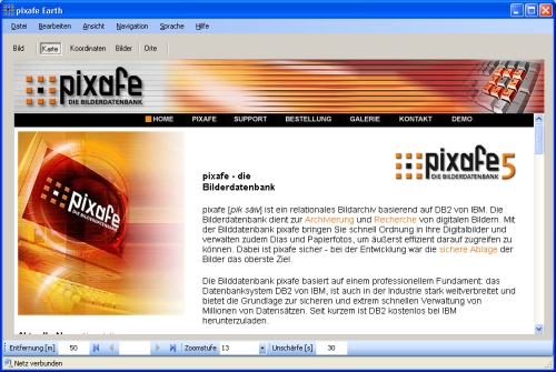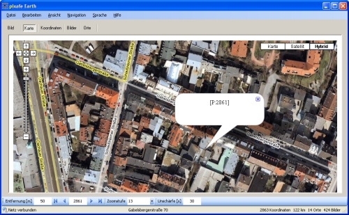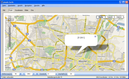 Zu jedem Bild, zu dem Koordinaten verfügbar sind, kann man sich in der Ansicht Karte die genaue Position des Bildes in drei verschiedenen Ansichten anzeigen lassen: Als Landkarte, als Satellitenbild oder als Hybriddarstellung (Satellitenbild mit eingeblendeten Straßennamen)